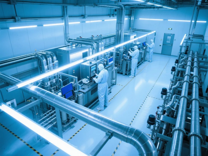 本百級(jí)車間采用"超凈工業(yè)未來主義"風(fēng)格,符合ISO14644-1Class3標(biāo)準(zhǔn)(≥0.1μm顆粒≤1,000/m³)。設(shè)計(jì)核心突破: