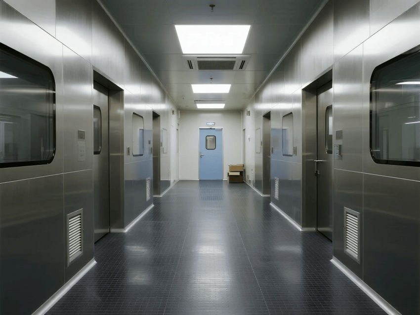 本車間以"未來科技"為設(shè)計(jì)導(dǎo)向,嚴(yán)格遵循ISO14644-1Class5標(biāo)準(zhǔn),打造高精度半導(dǎo)體制造環(huán)境。空間采用淺灰金屬壁板與深灰防靜電格柵地板的冷色調(diào)組合,營(yíng)造極具科技感的工業(yè)美學(xué)。