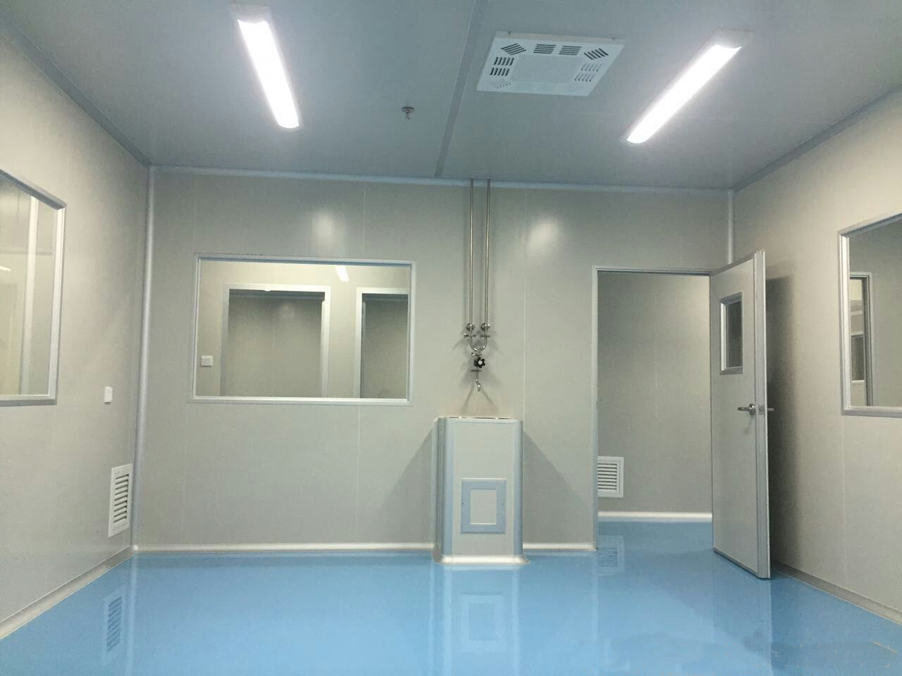 (1)操作室地面:1)剛性地面。剛性地面多為水磨石制造,其整體性好、光滑、不易起塵、易擦洗清潔,而且經(jīng)久耐用;2)涂料地面。常采用環(huán)氧自流坪地面,表面光滑、不易起塵、耐腐蝕可擦洗,但材料的硬度較低;3)彈性地面。使用聚氯乙烯彈性塑料制造,地面光滑、不起塵、耐腐蝕可擦洗,但不耐紫外線長期照射,不耐沖擊。(2)操作室墻面:1)磚墻+涂料(乳膠漆、仿磁漆、油漆);2)板材(彩鋼板、其他材料板)。(3)天花板:1)硬質(zhì)(混凝土);2)軟質(zhì)(輕鋼龍骨+板抹灰、石膏板,彩鋼板);(4)操作室內(nèi)門窗:1)門要能緊閉、平整、簡單,原則上朝潔凈級別要求高或室內(nèi)方向開啟,不采用木質(zhì)材料;2)窗應(yīng)無縫隙,室內(nèi)與墻面平,室外窗臺應(yīng)向下傾斜,不積塵。傳遞窗兩邊的門應(yīng)連鎖,密閉性好,易于清潔。