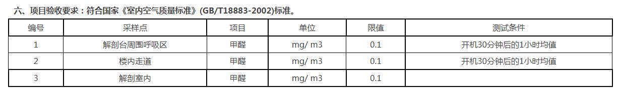 六、項目驗收要求:符合國家《室內(nèi)空氣質(zhì)量標(biāo)準(zhǔn)》(GB/T18883-2002)標(biāo)準(zhǔn)。