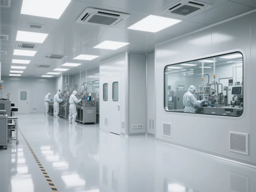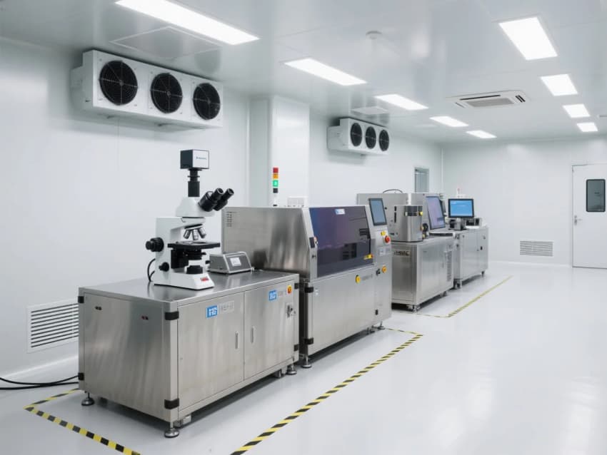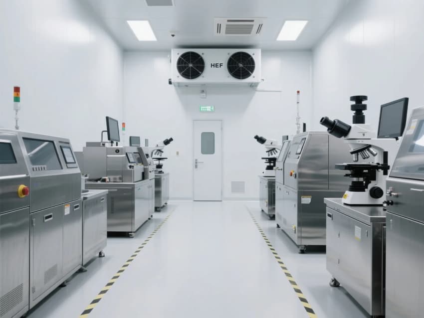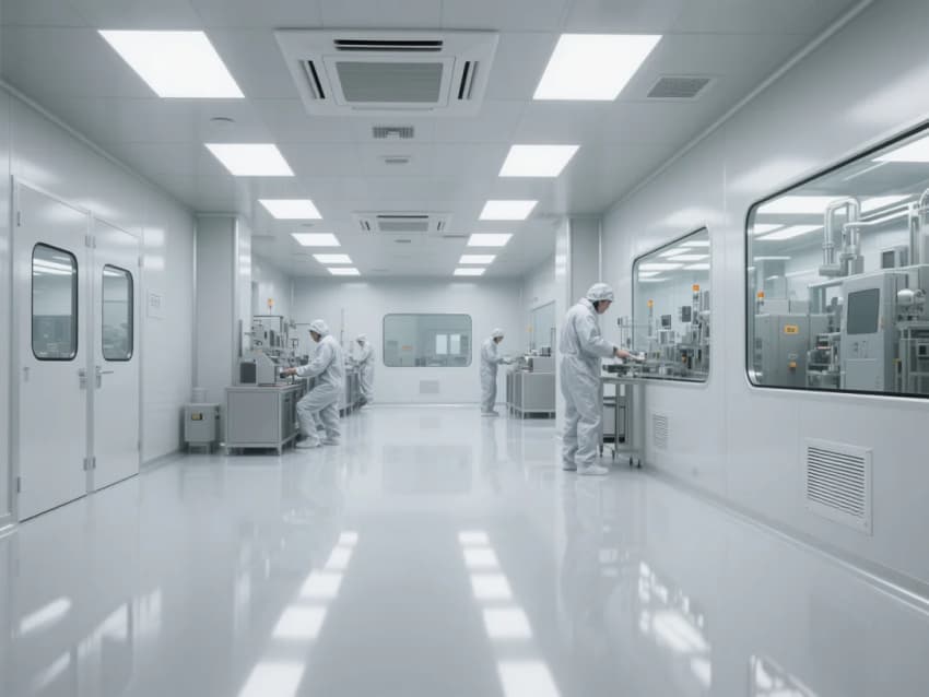本方案采用"科技極簡主義"風格,以ISO 5級(萬級)潔凈標準為核心。空間設計強調線性流動感,灰白主色調搭配防靜電環(huán)氧樹脂地坪,墻面采用抗菌彩鋼板。頂棚網格化FFU送風單元配合側墻回風,形成垂直層流。功能分區(qū)明確,包含更衣緩沖間(Class 7)、核心生產區(qū)(Class 5)、設備維護通道。智能控制系統(tǒng)集成溫濕度(22±1℃/45±5%)、壓差(+10Pa)、粒子監(jiān)測顯示。創(chuàng)新采用LED黃光照明減少光致氧化,設備基座增設主動減震系統(tǒng)。設計融合人機工程學,防靜電設施覆蓋率100%,通過藍色光帶引導潔凈動線,實現功能性與未來感的完美平衡。
