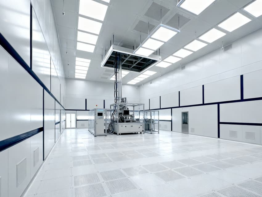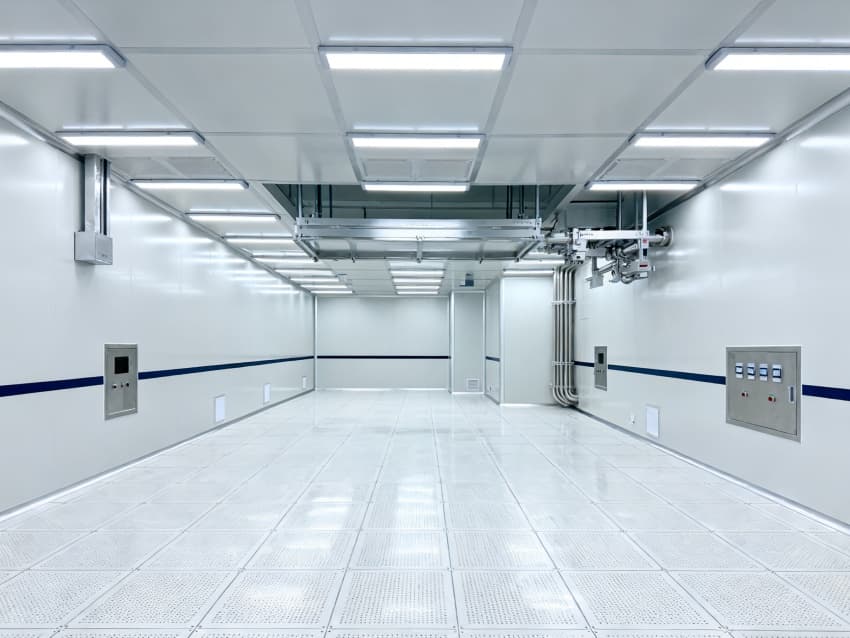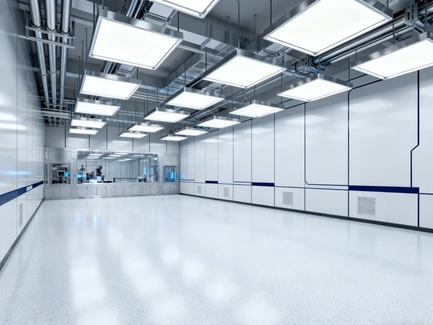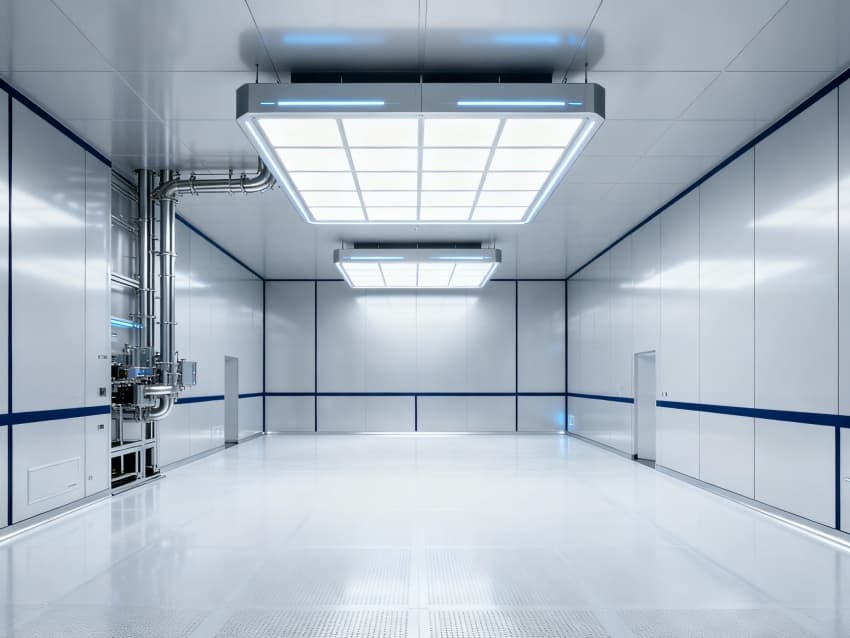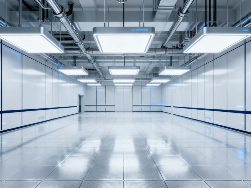 內(nèi)部6個量子車間均為無設(shè)備空曠布局,按千級潔凈標(biāo)準(zhǔn)與防電磁干擾要求建設(shè):地面鋪設(shè)防靜電環(huán)氧自流平,墻面采用無磁不銹鋼潔凈板,陰陽角做R50圓弧處理;柱網(wǎng)間距設(shè)為8米,預(yù)留充足設(shè)備安裝與運維空間;頂部整合恒溫恒濕系統(tǒng)、高效送風(fēng)口及防眩光LED照明,設(shè)備管線暗藏設(shè)計,進(jìn)一步強化空間空曠感,為量子芯片測試、量子傳感研發(fā)等場景提供穩(wěn)定、潔凈的專屬環(huán)境。
