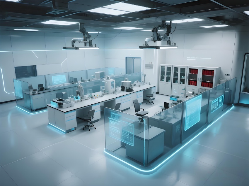 本設計以"科技賦能生命"為核心理念,構建純凈高效的研發環境。主體采用冰川白與醫用藍的漸變配色,墻面嵌入動態生物分子結構LED裝飾,營造科研儀式感。實驗區采用模塊化懸浮工作臺,透明智能玻璃隔斷實現空間通透性與功能分區的完美平衡。頂棚的流線型送風系統與地面熒光導視帶形成立體動線指引。核心無菌區采用圓形穹頂設計,搭配全息投影滅菌提示界面。數據分析中心配備曲面智能白板墻,實時可視化研究數據。危化品存儲區通過紅色光暈警示與物理隔離確保安全。整體空間融合醫療級潔凈美學與科幻實驗室語言,在嚴謹中注入未來感,通過智能交互界面與人性化燈光系統,打造國際一流水準的醫藥研發矩陣空間。