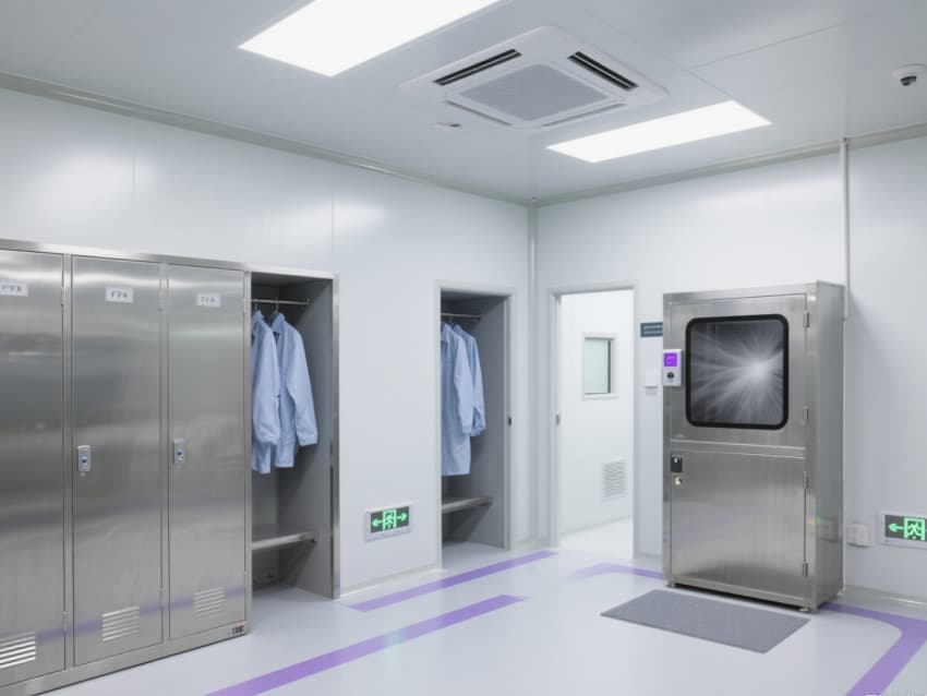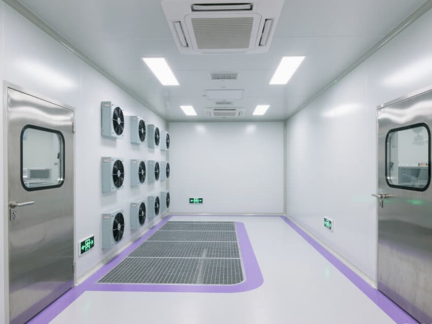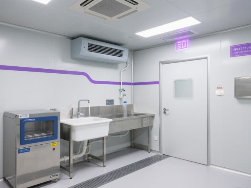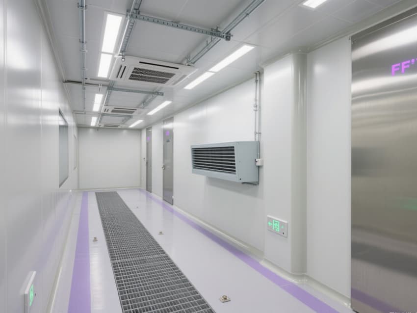 空間配備嵌入式LED潔凈燈(照度≥400lux)、恒溫恒濕控制系統(tǒng)(溫度22±1℃,濕度50±3%),不銹鋼潔凈門窗采用高氣密性密封結(jié)構(gòu)。實(shí)驗(yàn)區(qū)預(yù)留高精度儀器接口與防靜電接地端子,紫色氣流流線標(biāo)識引導(dǎo)操作動(dòng)線,全方位保障精密實(shí)驗(yàn)的準(zhǔn)確性與穩(wěn)定性。