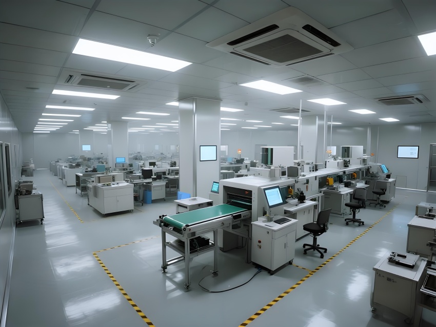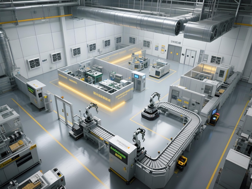 本車間以"精密工業美學"為設計主題,構建銀灰色主調的科技制造空間。頂棚矩陣排列的FFU單元形成蜂巢狀光影,與地面熒光綠流線導向標識構成三維潔凈動線。防靜電環氧地面嵌入銅絲導電網,墻面采用陽極氧化鋁板與可視壓差監測窗。核心SMT區配備全自動懸吊式貼片機群,紅色激光校準射線在設備間交織。黃光作業區采用琥珀色漫射照明,與普通區的冷白光形成鮮明功能區分。透明亞克力防塵簾分隔各工序段,AGV機器人沿藍色磁軌無聲穿梭。數據看板懸浮顯示實時良率與溫濕度參數,頂部螺旋風管配合地面回風口形成垂直層流。整體通過金屬冷質感與智能交互元素的碰撞,打造兼具工業嚴謹性與未來科技感的精密制造環境。