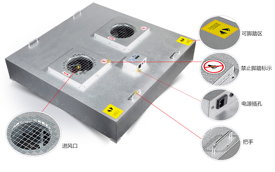 FFU為英文縮寫,全稱為 Fan Filter Units, 中文意思為"風機濾網單元"、“風機過濾機組”。確切地說是一種自帶動力、具有過濾功效的模塊化的末端送風裝置。風機從FFU頂部將空氣吸入并經HEPA過濾,過濾后的潔凈空氣在整個出風面以0.45m/s±20%的風速均勻送出。FFU可模塊化連接使用,使得FFU廣泛應用于潔凈室,潔凈工作臺,潔凈生產線,組裝式無塵室和局部百級等應用場合。利用FFU層流罩可以制作簡易潔凈工作臺,潔凈棚,潔凈傳遞柜和潔凈存衣柜。在新建潔凈室、潔凈廠房式改造翻新中,即可提高潔凈度級別,降低噪音和振動,也可大大降低造價,安裝維護方便,是潔凈環境的理想部件。