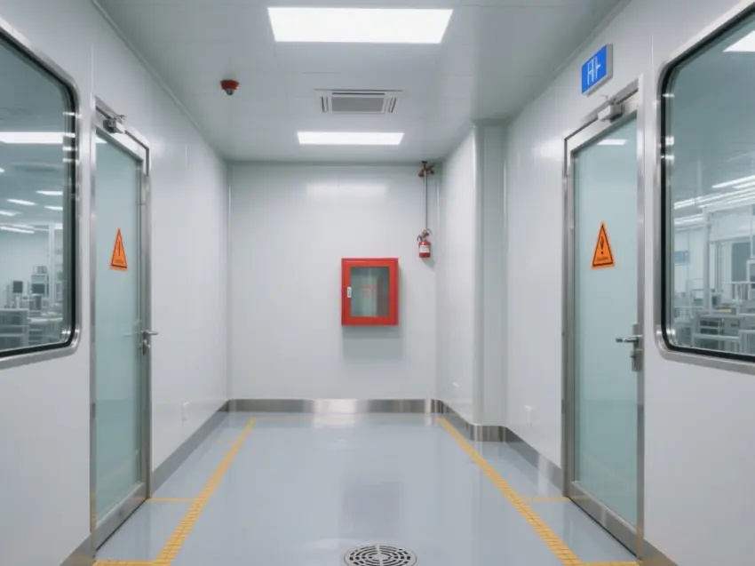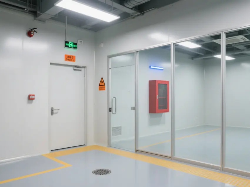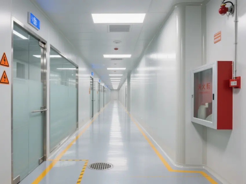 車間內(nèi)配備了多個紅色的消防箱,確保消防安全。墻壁上還設有緊急出口標志,為人員在緊急情況下提供指引。車間內(nèi)的門大多是玻璃門,便于觀察內(nèi)部情況。