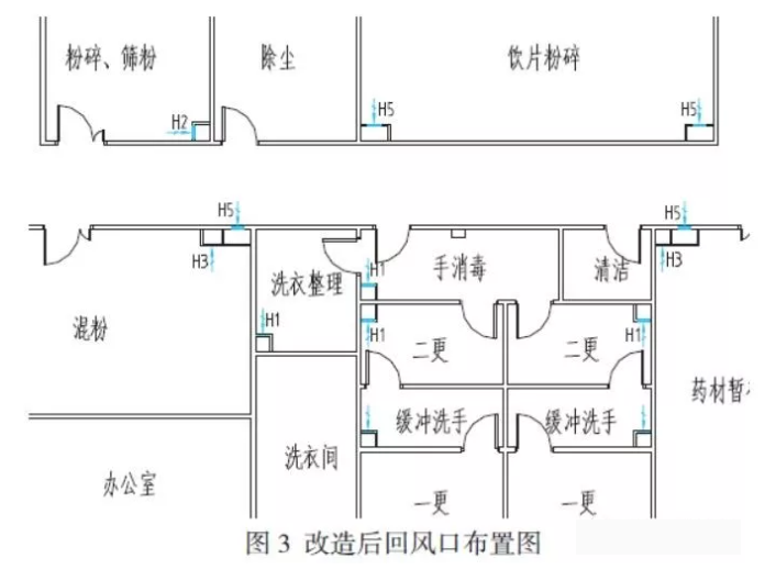 在使用中問題就來了,低壓力級別房間潔凈度不達(dá)標(biāo),只能開大送風(fēng)口閥門。后來,要么房間受污染空氣漏至外潔凈走廊,污染整個區(qū)域,要么潔凈走廊風(fēng)吹進(jìn)這些低壓力房間,導(dǎo)致其無法回風(fēng),房間新風(fēng)量嚴(yán)重不足,嚴(yán)重影響使用,使用方只能關(guān)閉潔凈空調(diào)進(jìn)行生產(chǎn)。這樣,運行不到一年就進(jìn)行改造設(shè)計。