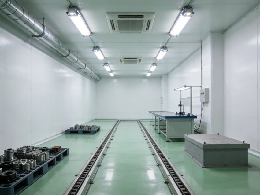 車(chē)間內(nèi)部施工工藝凸顯工業(yè)適配性:地面采用淺綠色防油耐磨環(huán)氧地坪工藝,經(jīng)基層固化處理、環(huán)氧砂漿找平、耐磨骨料撒布、罩面封閉四道核心工序,表面平整度誤差≤0.8mm/m,抗壓強(qiáng)度達(dá)C30以上,可耐受設(shè)備碾壓與油污侵蝕;墻面采用白色工業(yè)級(jí)潔凈涂層施工,推行無(wú)縫拼接技術(shù),陰陽(yáng)角采用R40圓弧倒角工藝,杜絕積塵死角,涂層附著力強(qiáng),可耐受高頻次清潔與工業(yè)粉塵侵蝕。