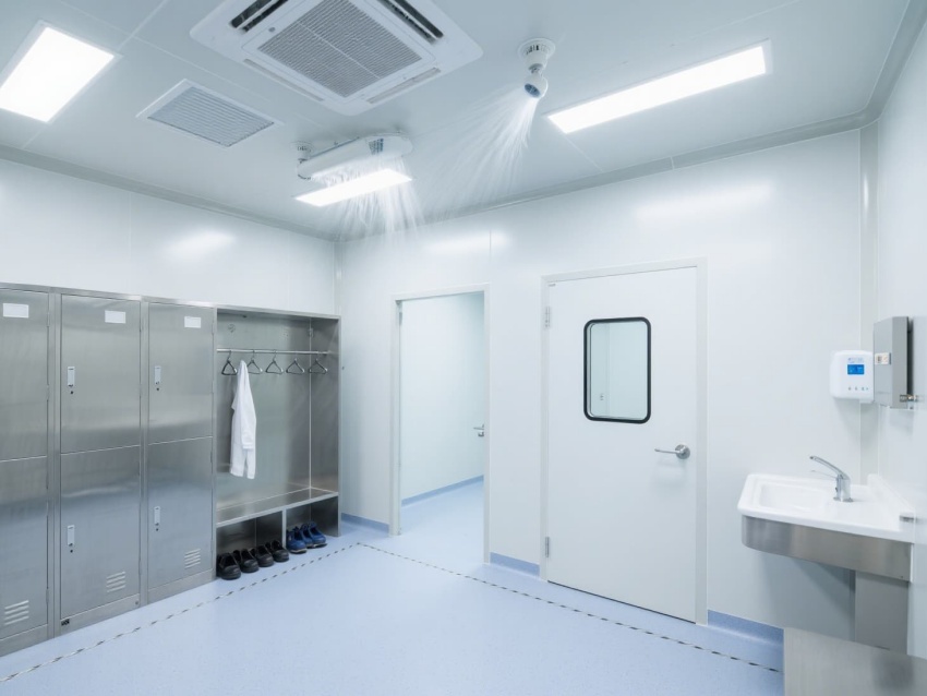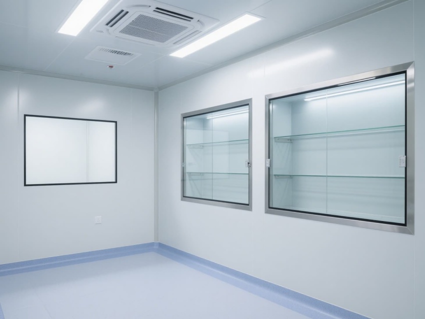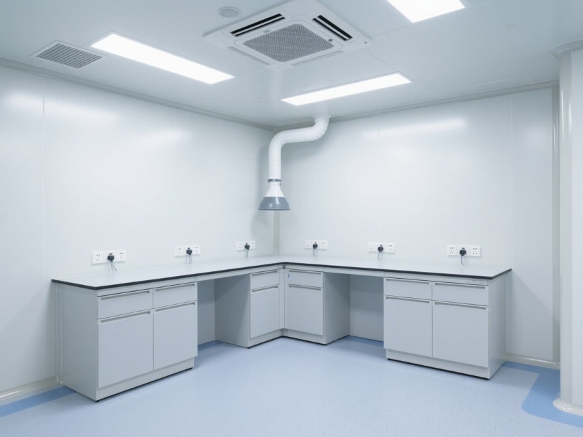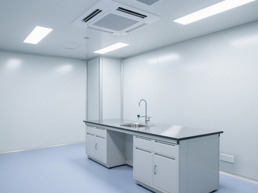 實(shí)驗(yàn)室以白色抗菌彩鋼板構(gòu)建墻體與吊頂,搭配淺藍(lán)灰色防靜電環(huán)氧地坪,整體色調(diào)簡潔明快。墻面與地面的圓弧角設(shè)計(jì)避免積塵,便于高頻次消毒清潔。頂部高效過濾器形成單向流氣流,每小時(shí)15-20次空氣置換,維持室內(nèi)正壓以防外界污染。?