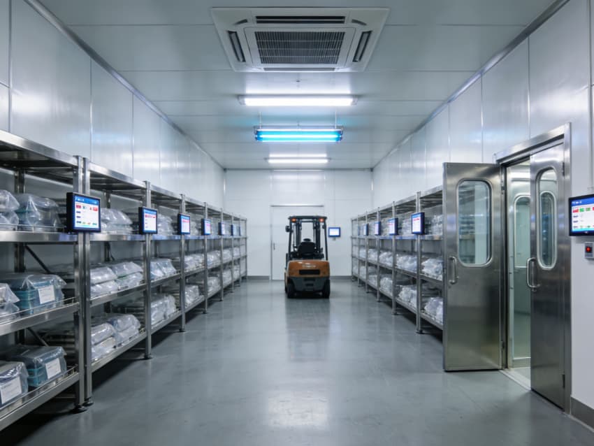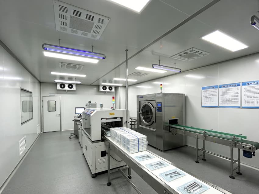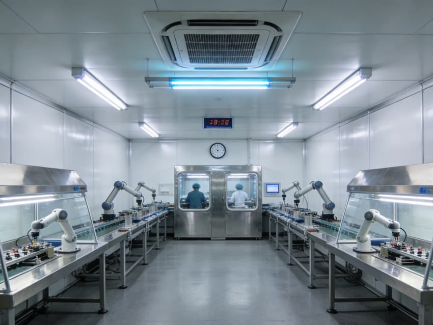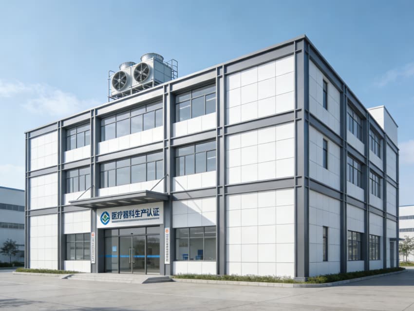 白色墻面采用食品級潔凈抗菌涂層,推行無縫拼接工藝,陰陽角采用R50圓弧倒角設計,徹底消除清潔死角,潔凈度可達Class 8級標準。車間科學劃分無菌裝配區、檢測區、物料倉儲區等功能區域,無菌區配備層流凈化預留系統,檢測區預留精密檢測儀器安裝位與恒溫調控接口,各區域均設置獨立消殺通道與物料傳遞窗口,全方位護航醫療器械生產品質。